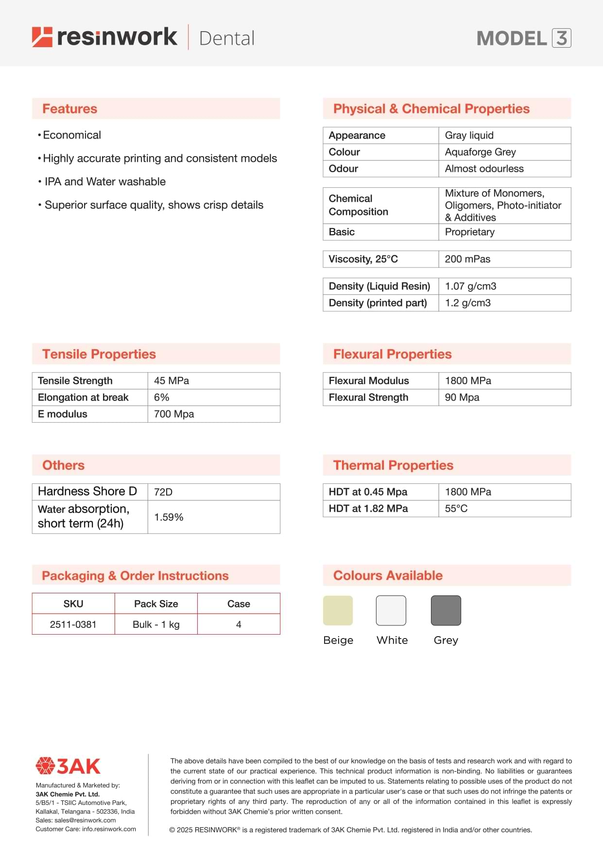 RESINWORK MODEL 3 AQUAFORGE - IPA & WATER WASHABLE 3D PHOTOPOLYMER RESIN (1 KG)
