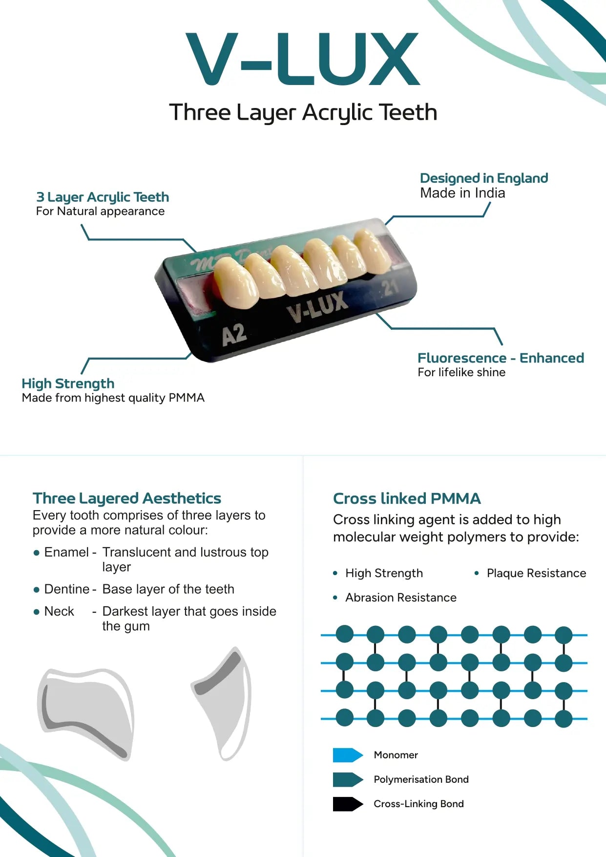Prosthetic teeth with Three layers for natural-looking aesthetics.